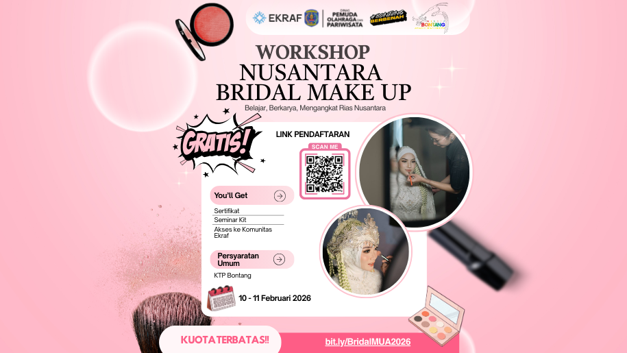 Dalam rangka mendukung pengembangan subsektor fesyen dalam ekosistem ekonomi kreatif, Bidang Ekonomi Kreatif Kota Bontang menyelenggarakan Workshop Nusantara Bridal Make Up yang dilaksanakan pada 10 s.d 11 Februari 2026 di Hotel Bintang Sintuk, Kota Bontang. Kegiatan ini terbuka bagi masyarakat umum, pelaku usaha jasa kecantikan, pelajar, mahasiswa, serta komunitas kreatif yang ingin meningkatkan keterampilan di bidang tata rias pengantin.